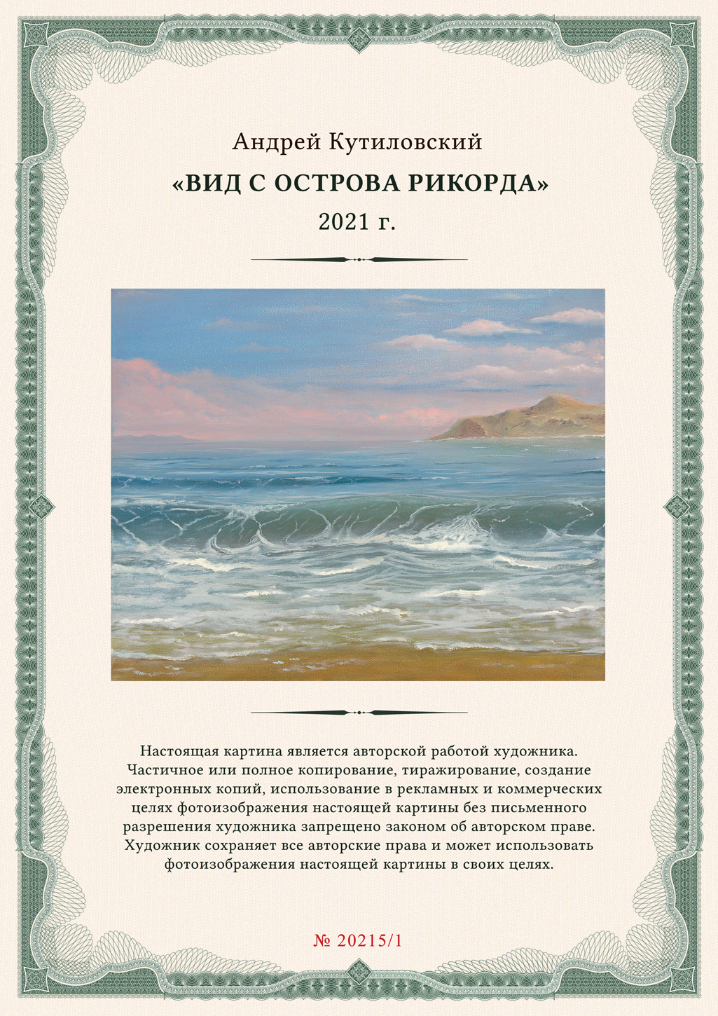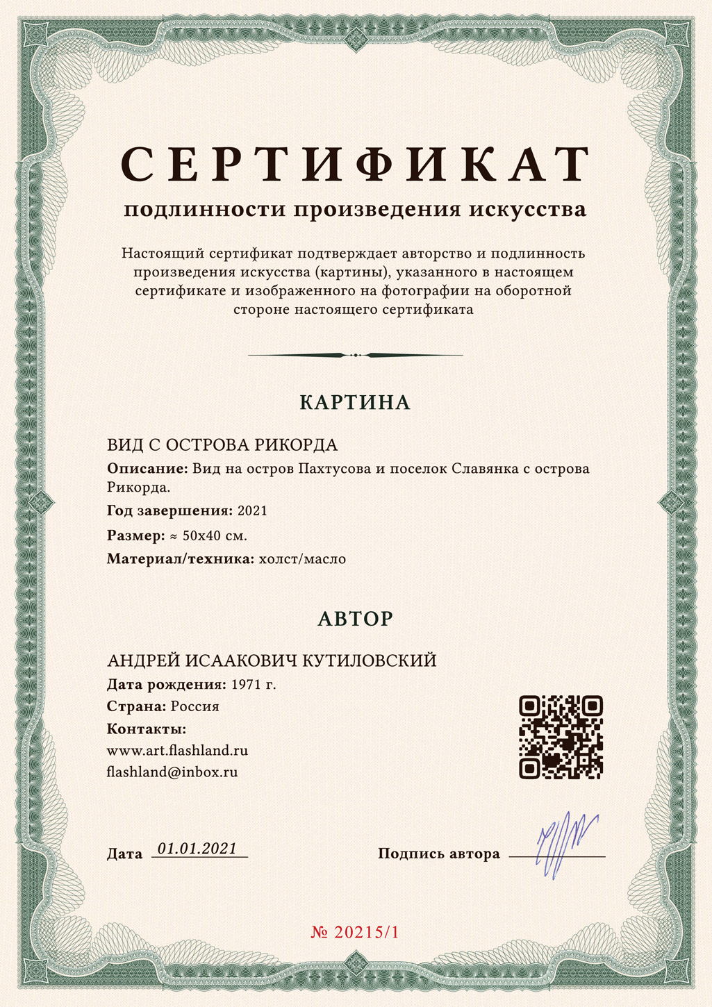 Абсолютно все полотна Андрея Кутиловского имеют сертификат подлинности произведения искусства на защищенной, госзнаковской бумаге с водяными знаками, с подписью автора, с присвоенным уникальным ID номером.