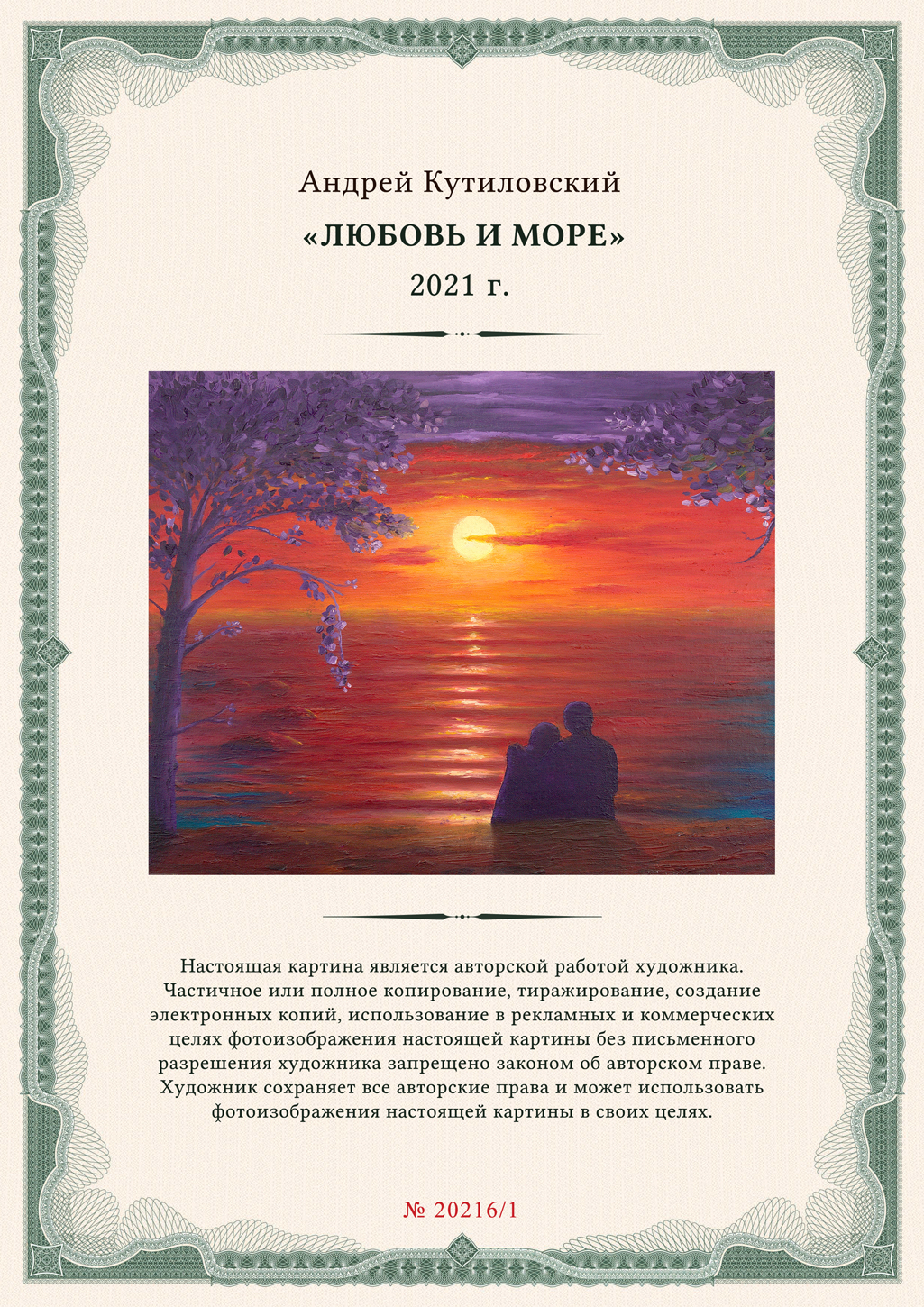 Абсолютно все полотна Андрея Кутиловского имеют сертификат подлинности произведения искусства на защищенной, госзнаковской бумаге с водяными знаками, с подписью автора, с присвоенным уникальным ID номером.