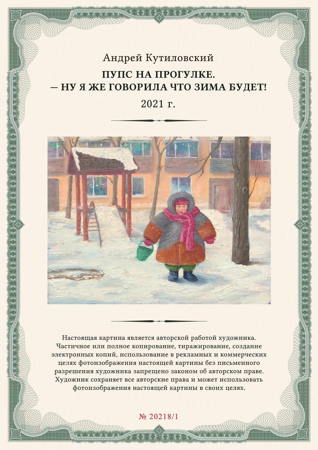 Абсолютно все полотна Андрея Кутиловского имеют сертификат подлинности произведения искусства на защищенной, госзнаковской бумаге с водяными знаками, с подписью автора, с присвоенным уникальным ID номером.