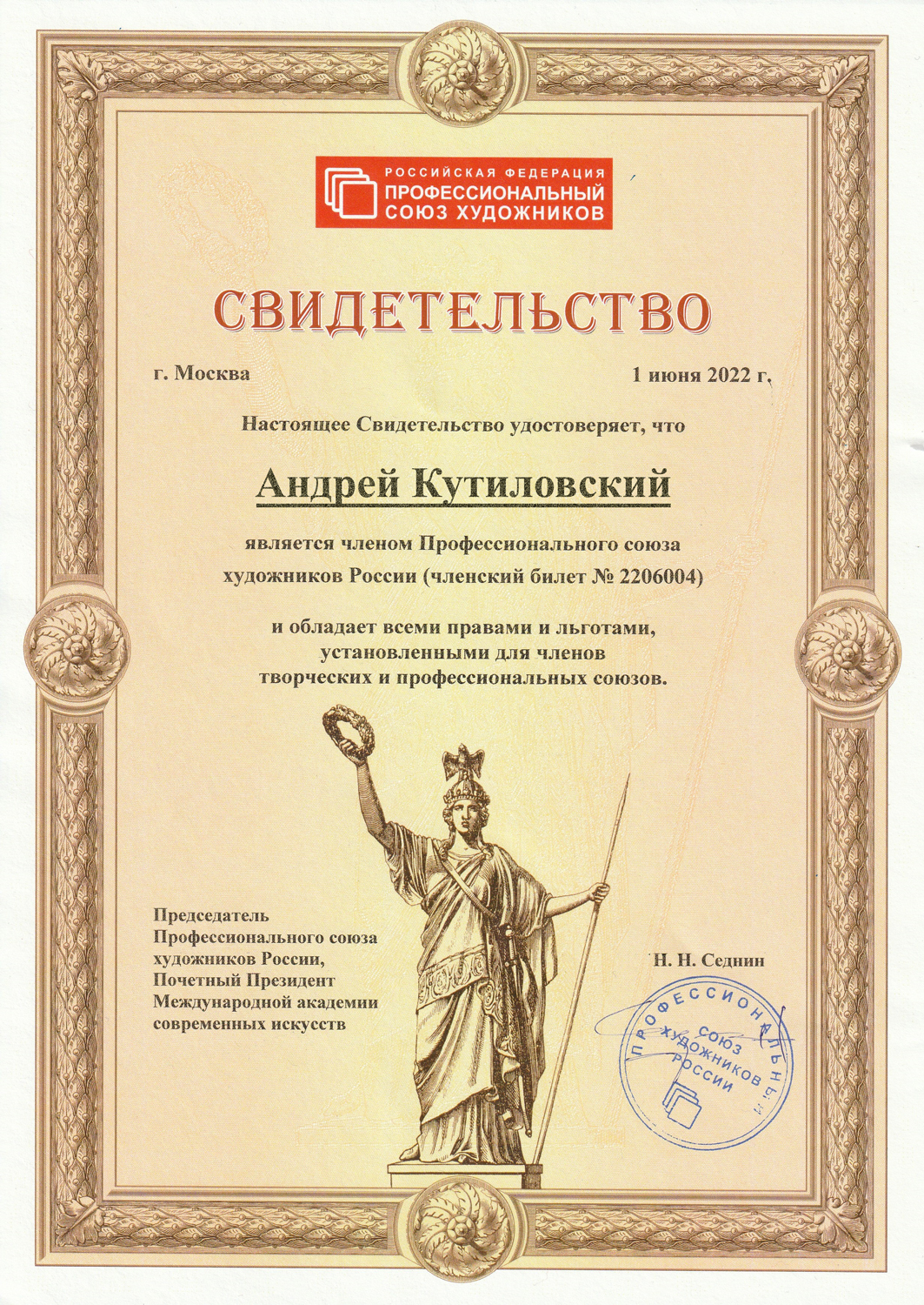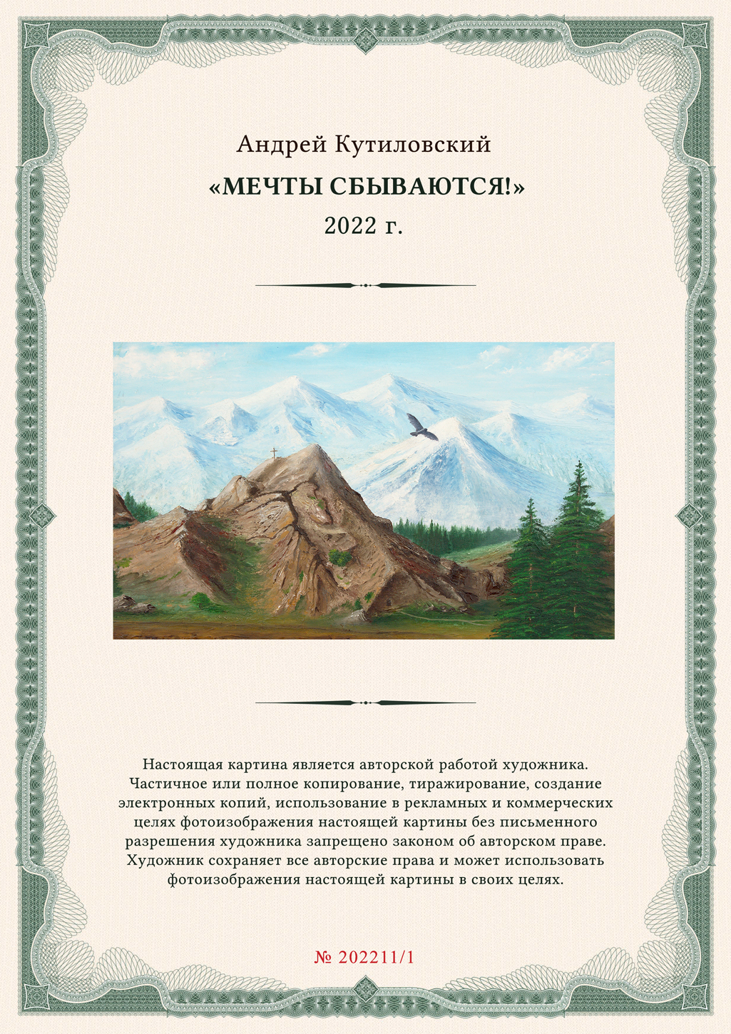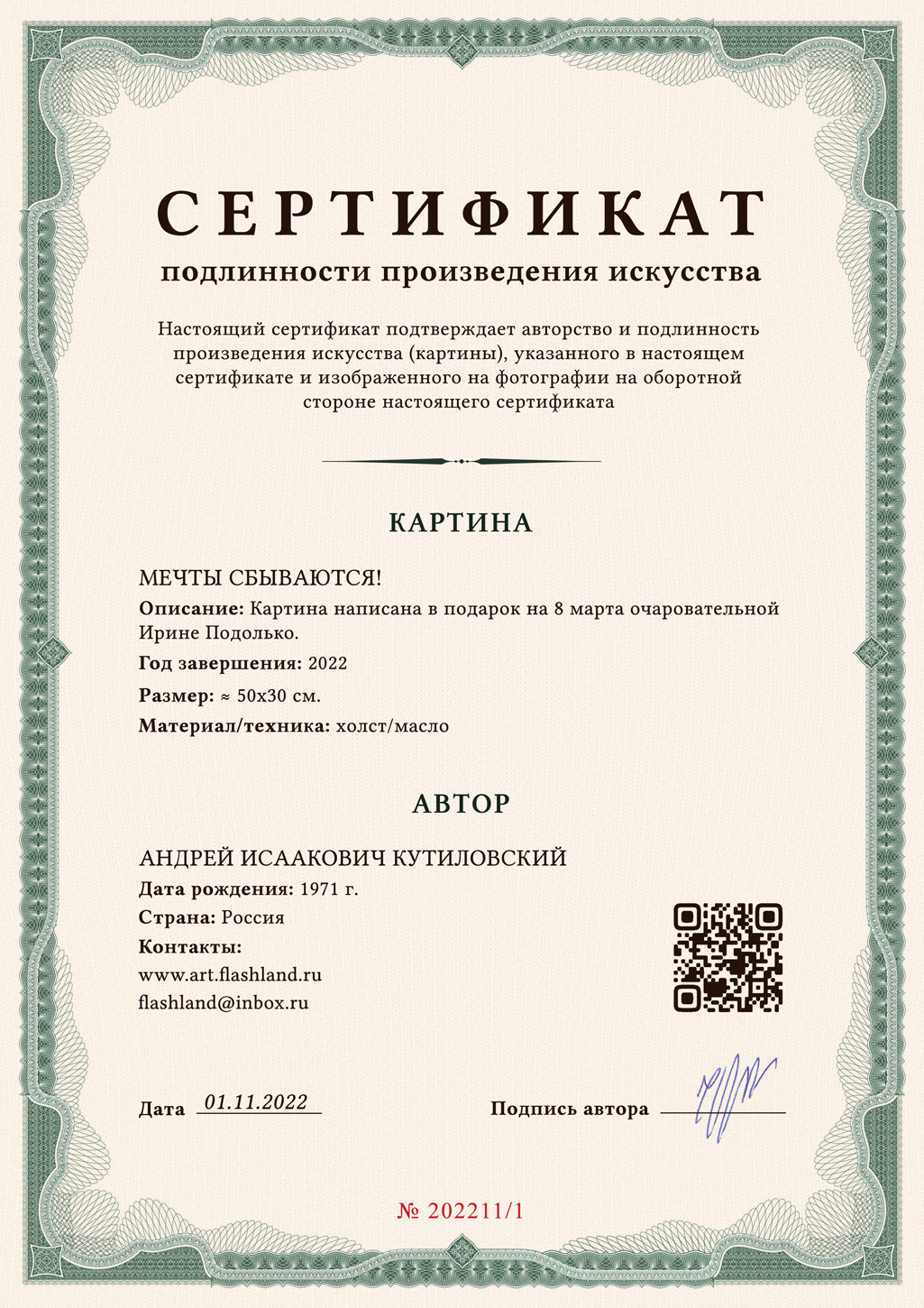 Абсолютно все полотна Андрея Кутиловского имеют сертификат подлинности произведения искусства на защищенной, госзнаковской бумаге с водяными знаками, с подписью автора, с присвоенным уникальным ID номером.