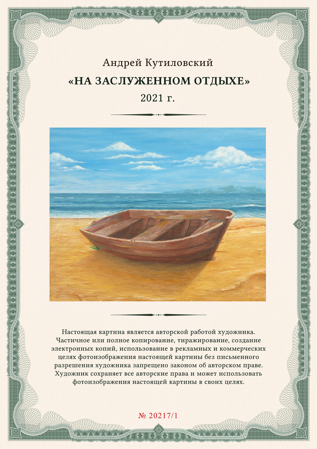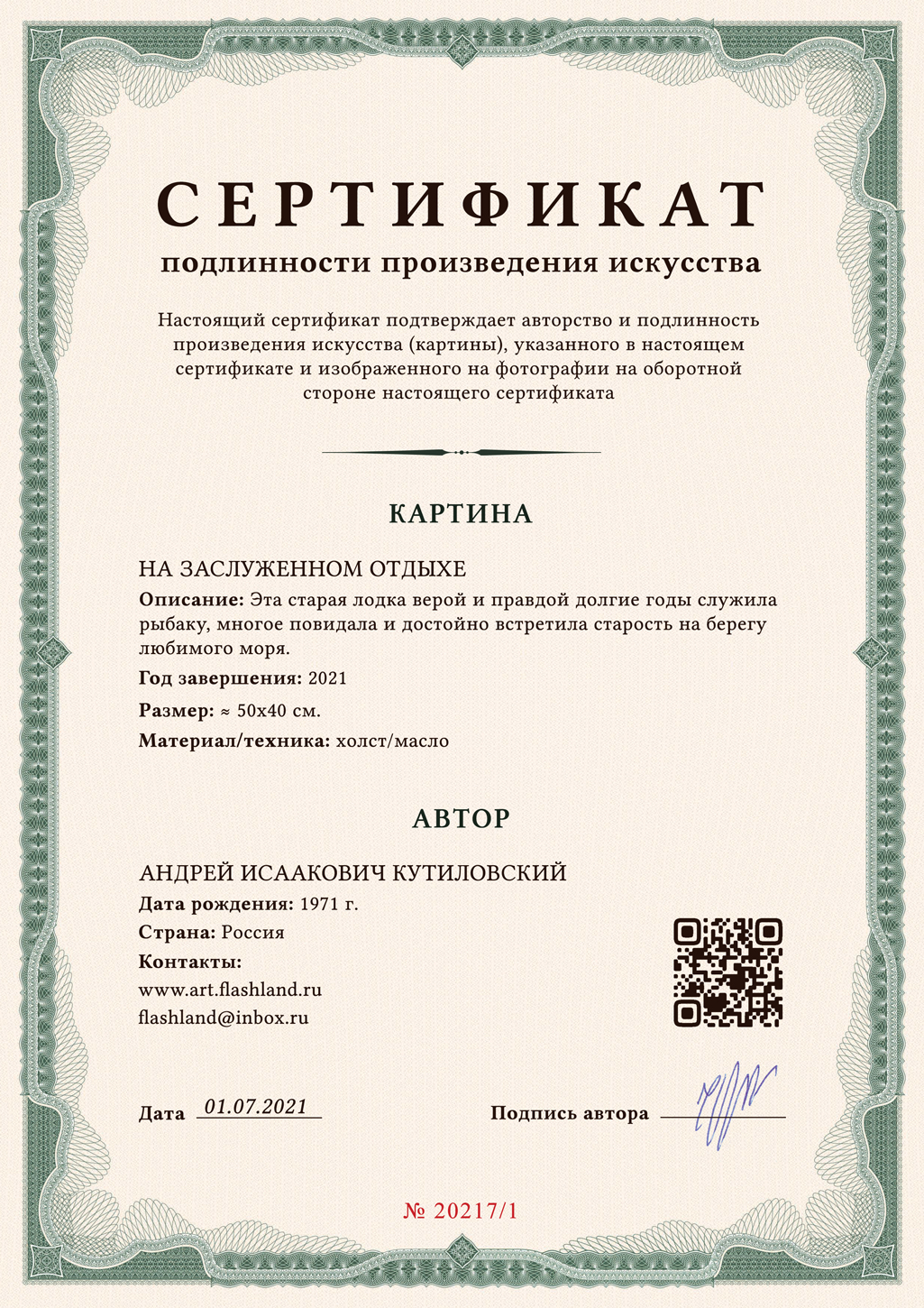 Абсолютно все полотна Андрея Кутиловского имеют сертификат подлинности произведения искусства на защищенной, госзнаковской бумаге с водяными знаками, с подписью автора, с присвоенным уникальным ID номером.