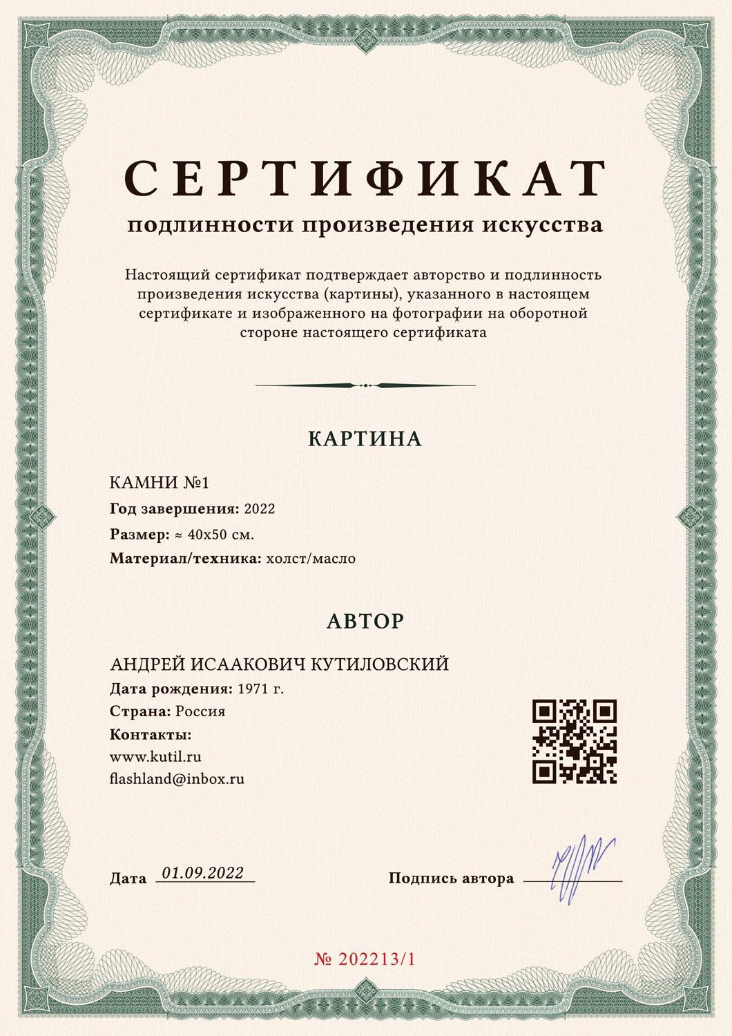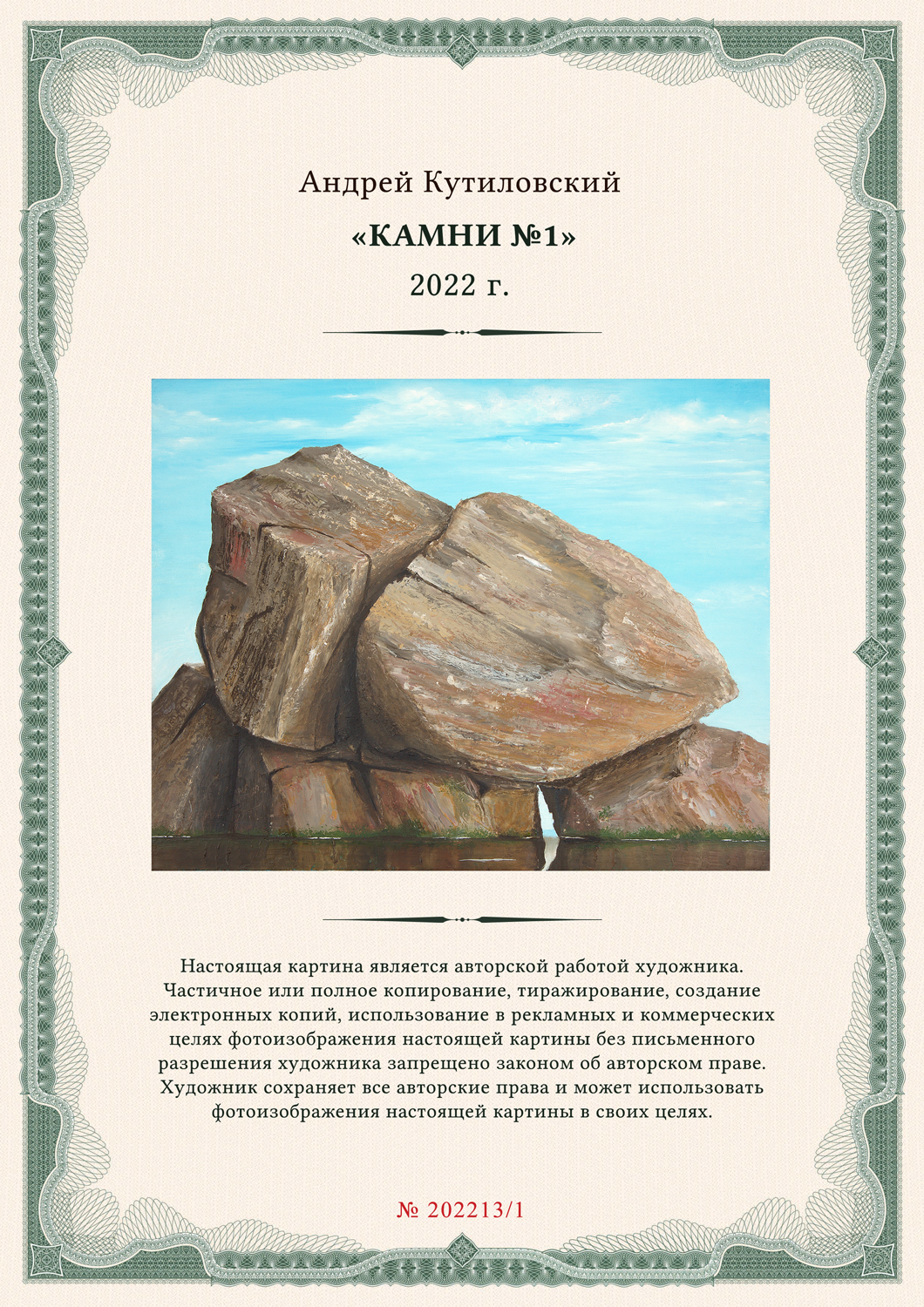 Абсолютно все полотна Андрея Кутиловского имеют сертификат подлинности произведения искусства на защищенной, госзнаковской бумаге с водяными знаками, с подписью автора, с присвоенным уникальным ID номером.